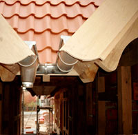 Da alles aus einer Hand gefertigt wurde passen die Bauteile nicht nur funktional sondern auch optisch gut zusammen. Hier treffen sich die beiden Dächer der nebeneinander stehenden Gebäude und es entsteht ein überdachter Gang der zu den hinteren Räumlichkeiten führt. |